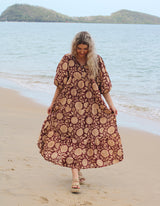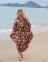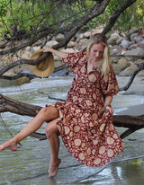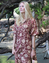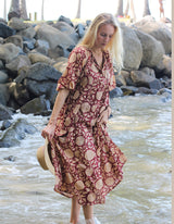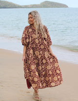 Neera maxi is now available in Burgundy Sunflower. This stunning piece has it all- comfort, style and mood. Style it buttoned high for an elevated look, or more relaxed look with the denim jacket and boots. This dress is fully lined.