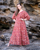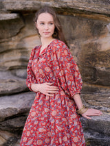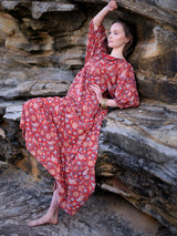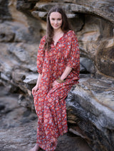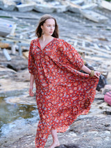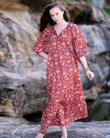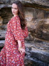 Laal Soma has rusty warm hues of red and orange, contrasted with hints of cool grey in a timeless bird and flower design You will fall in love with this dress!