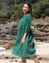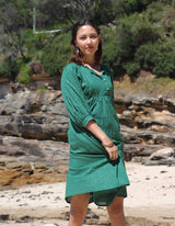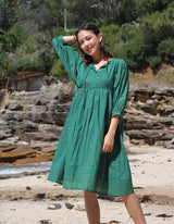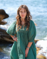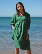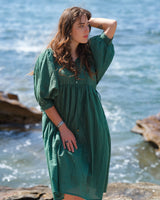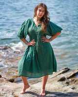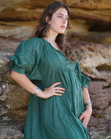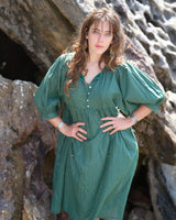 It has trim on the sleeves, as well as strings with bells, and front buttons to adjust the neckline. This dress is made ethically in very small quantities.