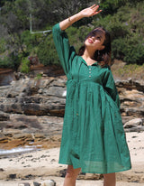 Our new Jade print is so soothing and fresh! Made with soft cotton fabric. It has pockets and side-ties for adjustable waist. Lined.