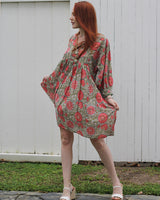 It has trim on the sleeves, as well as strings with bells, and front buttons to adjust the neckline. This dress is made ethically in very small quantities.