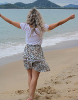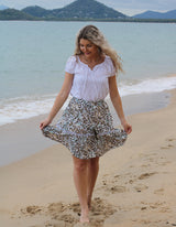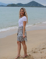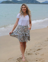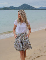 This lovely leopard skirt is designed with a elastic waist band, tie and pockets. Such a gorgeous figure flattering skirt!